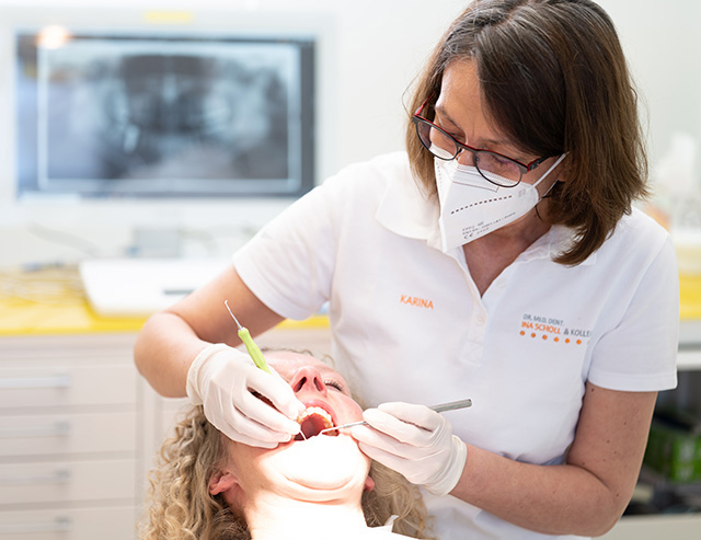 Die Intervalle der Zahnreinigung sind individuell unterschiedlich. Bei jungen Patient*innen, die regelmäßig Zahnseide verwenden, ist unter Umständen eine Prophylaxesitzung jährlich ausreichend. Beim durchschnittlichen Erwachsenen ist die Prophylaxe zweimal pro Jahr anzuraten. Unsere Parodontitispatient* innen, die bereits eine Parodontalbehandlung erhalten haben, und/oder diejenigen, bei denen eine genetische Prädisposition festgestellt wurde, sollten auf jeden Fall drei bis viermal jährlich einen Termin bei der Prophylaxehelferin vereinbaren.